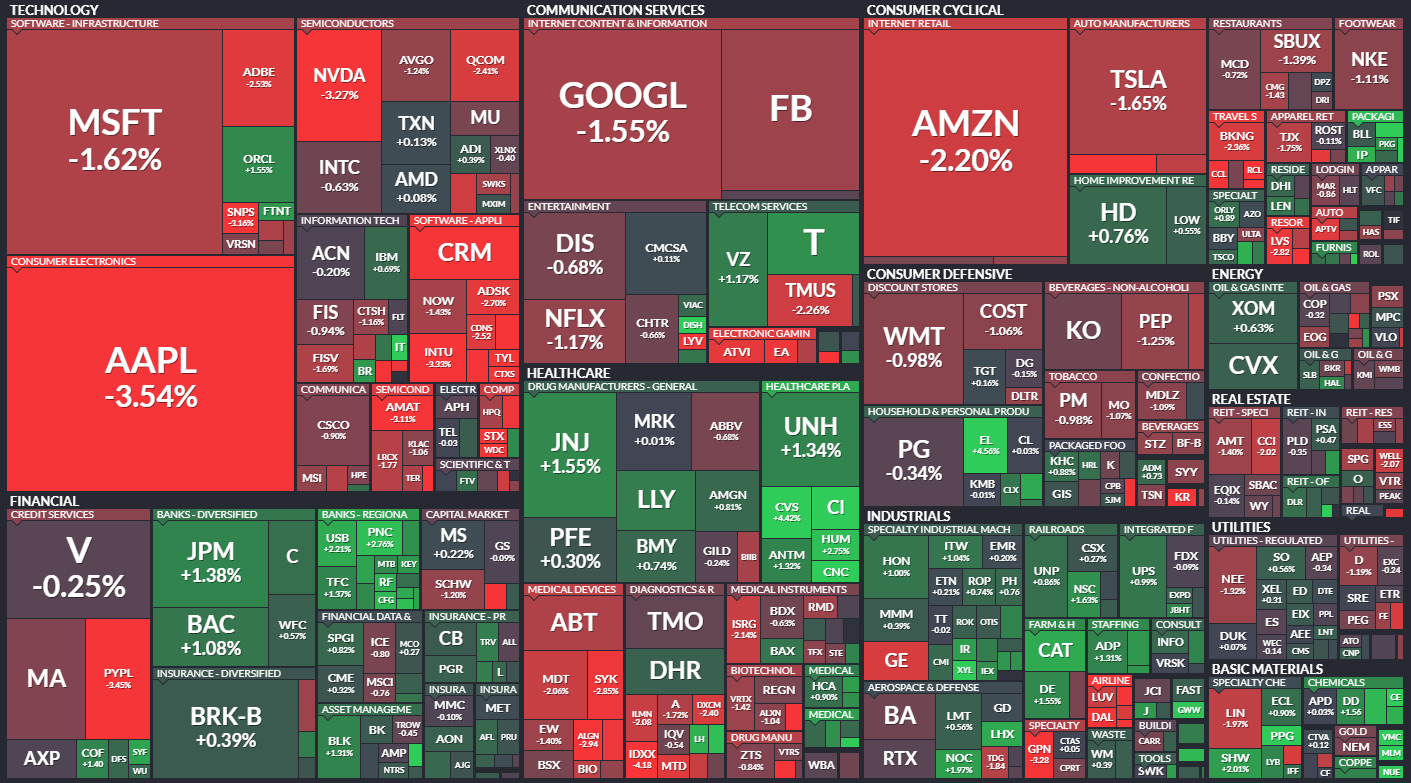 情報技術や通信サービス、一般消費財セクターが大きく下げました。