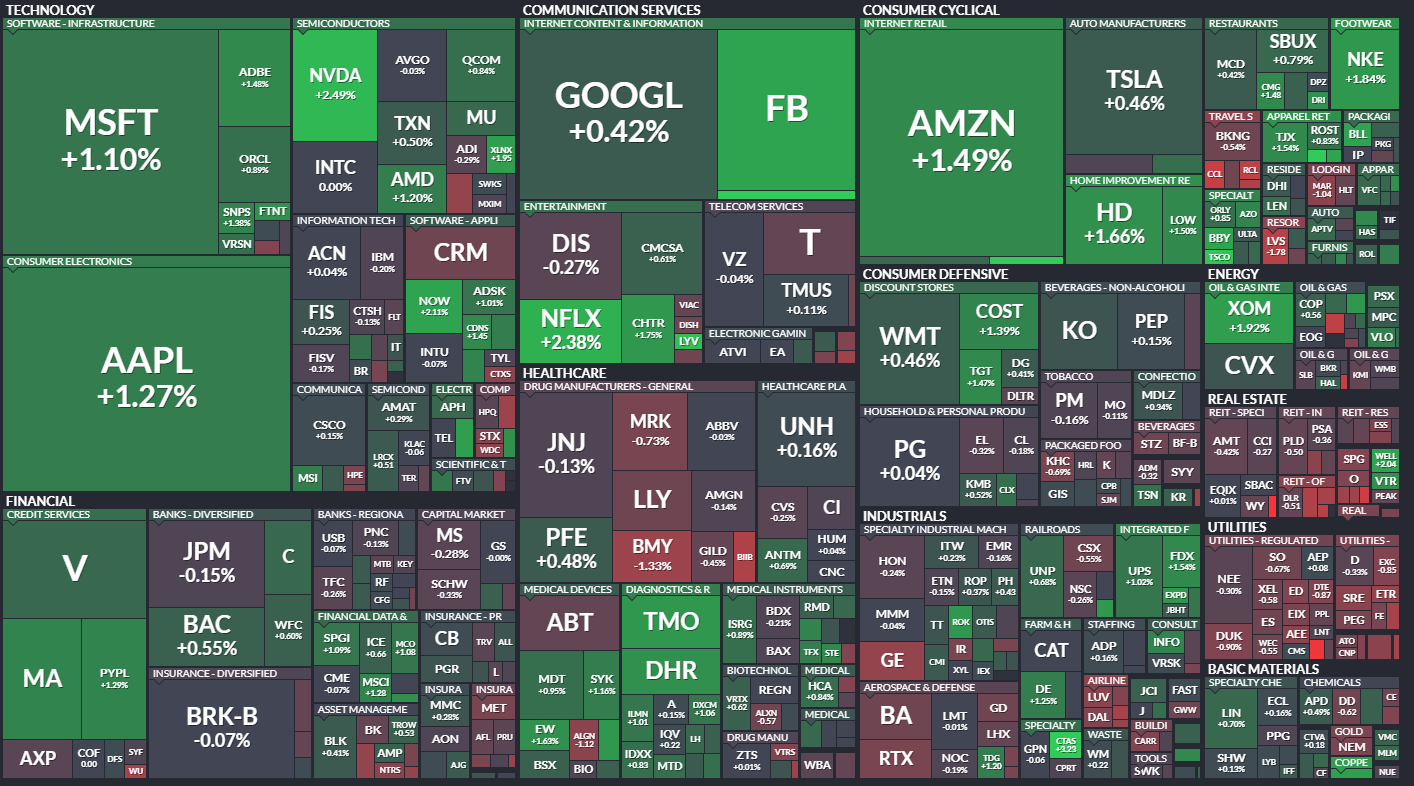 エネルギー、素材、資本財、一般消費財、テクノロジー、通信サービスが1%前後上昇。