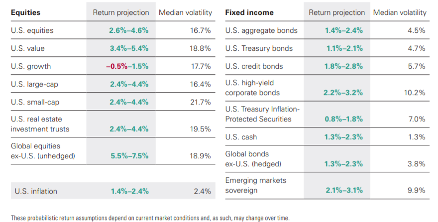 2021年3月31日時点から10年間の名目リターンの予測。年率・ドルベース