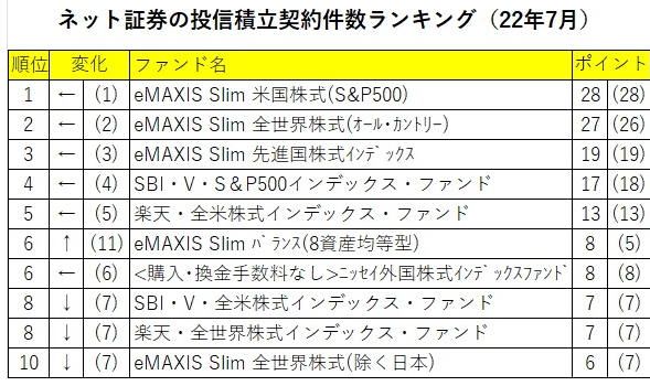 モーニングスターが、SBI証券、楽天証券、マネックス証券のネット証券大手3社の7月の投信積立契約件数トップ10を公開していたので紹介します。