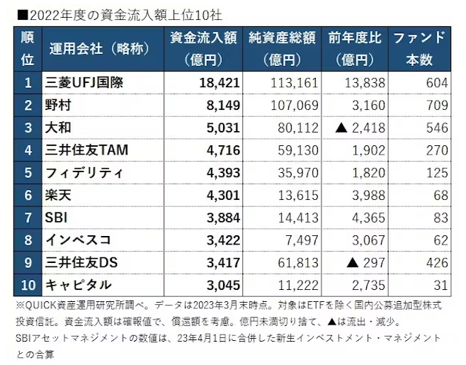 「2022年度の資金流入額、三菱UFJ国際がトップ」という記事がありました。
