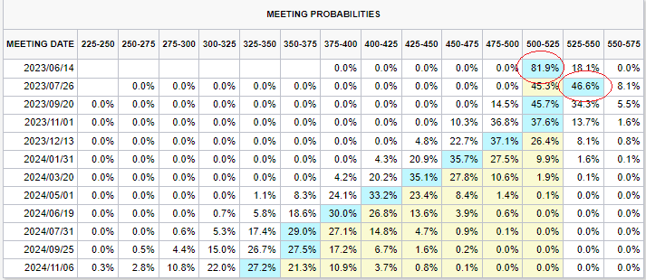 これらの発言や経済指標を受けて、6月の利上げ停止の確率を市場は大きく織り込みました。