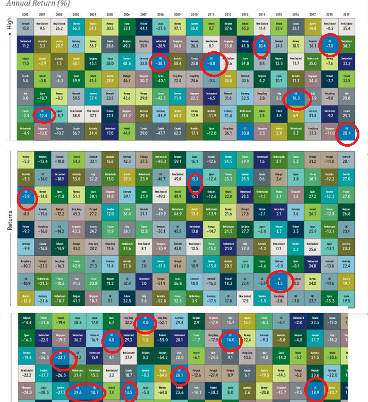 また、国ごとの入れ替わりをみてもかなり不規則で、翌年や将来のトップパフォーマーを当てるのは困難なように思います。