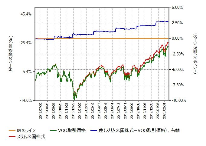 VOOの取引価格とスリム米国株式の基準価額の比較です。