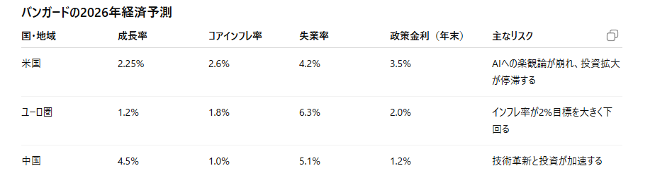 バンガードは2026年について、米国は減速はするが景気後退ではない。金利は下がるが、AI期待の揺り戻しに注意。欧州は低成長、低インフレ。中国はテクロノジー主導で回復。リスクは高いが成長余地も大きいという構図を描いています。