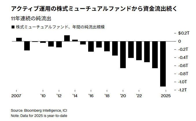 資金の純流出は11年連続で、一部指標では2025年が最大規模の流出となる。一方でパッシブ運用の株式上場投資信託(ETF)には6000億ドル余りが流れ込んだ。