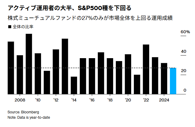 米国では2025年株式ミューチュアルファンドの73%がS&P500を下回りました。