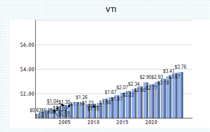 例えば、VTIの分配金は過去下の図のように増えてきました。