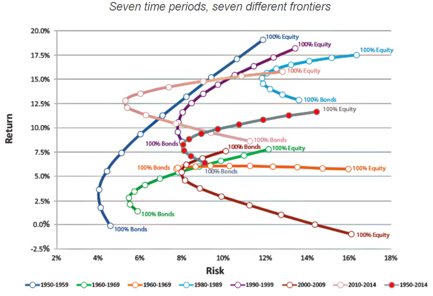 赤丸のついたグレーのラインが全期間(1950年から2014年)の効率的フロンティアを