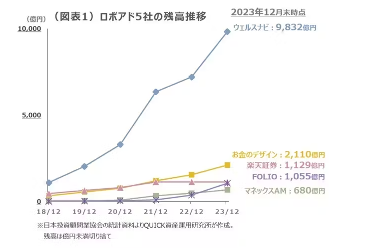 2023年12月末ではウェルスナビが9832億円と断トツだった。今年に入ってからも増加の勢いは続き、同社は24年5月10日時点で1兆2000億円を突破したと発表がありました。