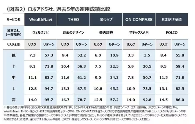 先日日経新聞に「ロボアドバイザー主要5社、過去5年の運用成績を比較」というタイトルで、ロボアド大手5社が全てのコースでリターンプラスだったという記事がありました。