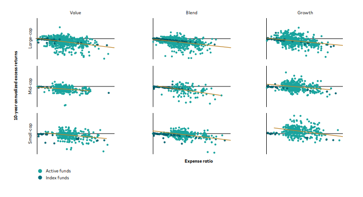 横軸が経費率。縦軸がリターン。横の黒い直線がインデックス(ベンチマーク)