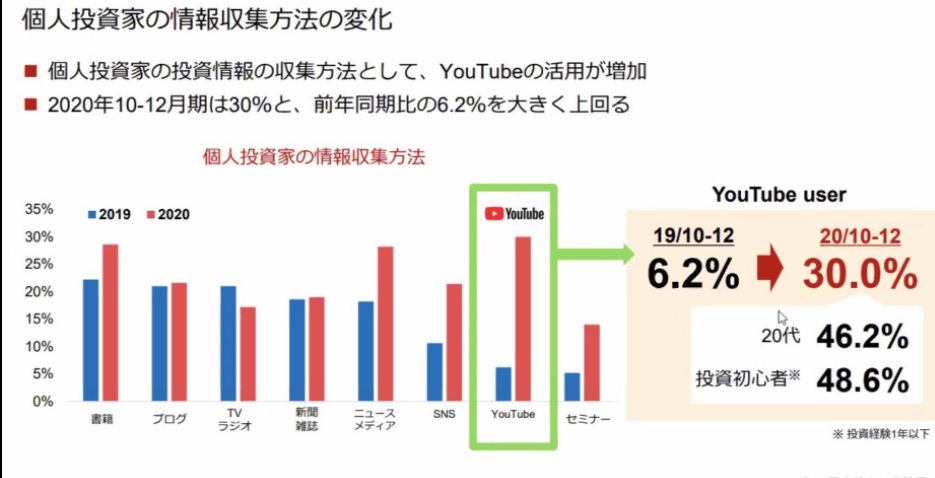 20代や初心者では、約半数がYouTubeをメインの情報収集としている(楽天証券)